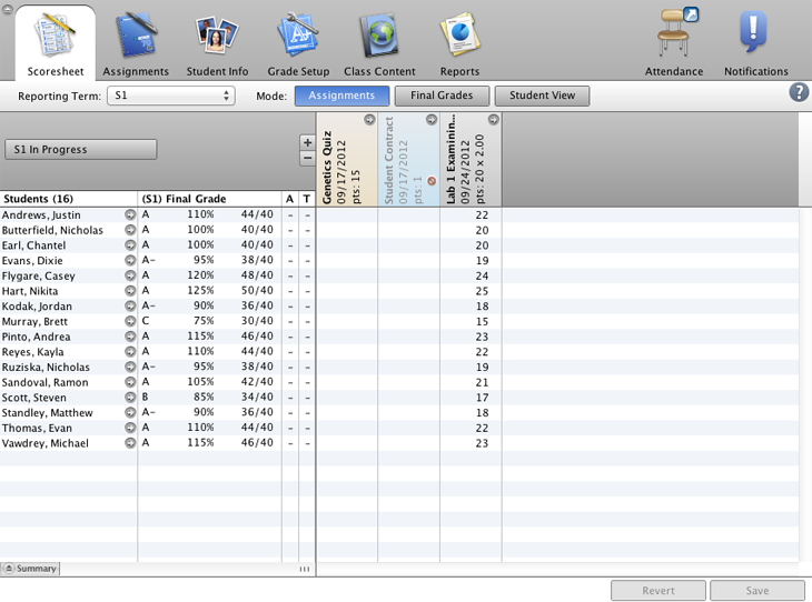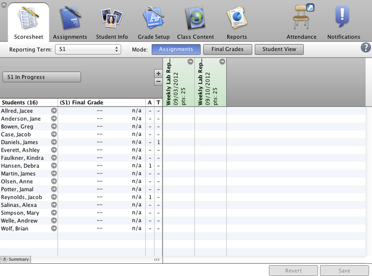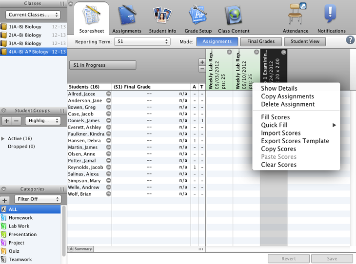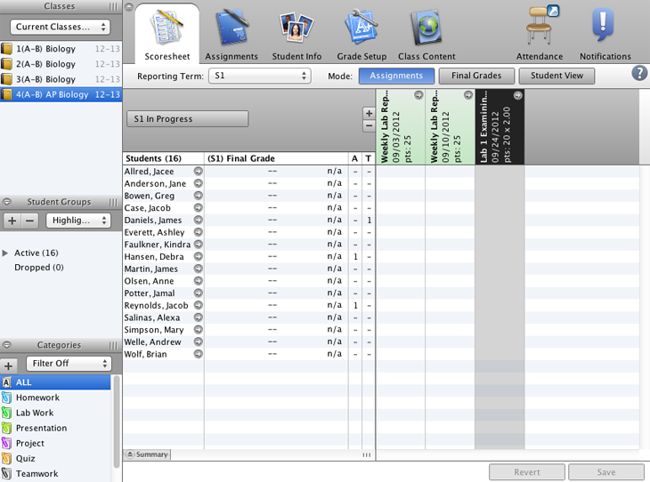 Enter scores for the “Lab 1 Examining Cells” assignment for your third period Biology class.